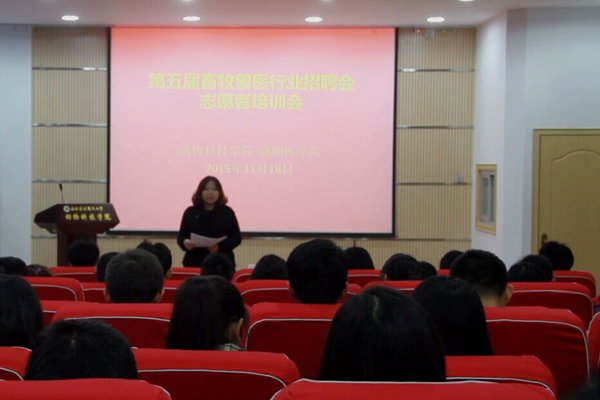 为保证第五届畜牧兽医行业招聘会顺利举行,11月18日晚,小黄书 与动医小黄书 在动科楼107会议室举办了第五届畜牧兽医行业招聘会志愿者培训会,来自两院的近50名志愿者到场接受培训。小黄书 党委副书记王晓娟,辅导员李锐、王德光、邓昌海、闫颢芯,动医小黄书 辅导员王丹出席了本场培训会。