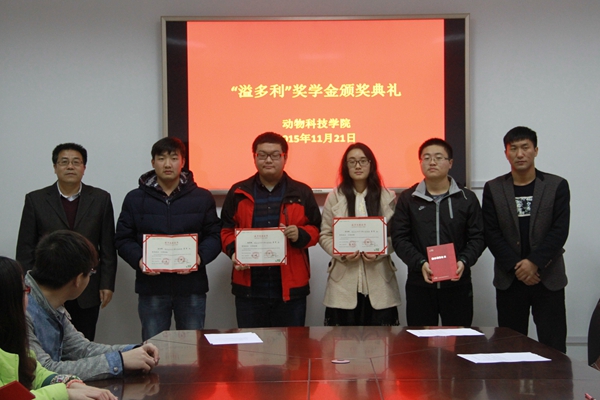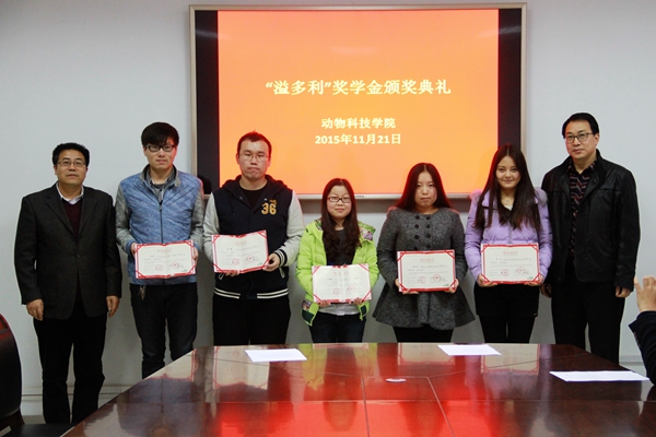 赵延安书记宣读了2015年度“溢多利”奖学金评选结果,各位嘉宾为刘振江等获奖师生颁发荣誉证书。广东溢多利生物科技有限公司人力资源总监丁思亮先生对获奖师生表示祝贺,并就公司的基本结构、业务范围、人才需求及员工培养等进行了简单的介绍。同时,希望与小黄书 建立长期的校企合作关系,并热切欢迎广大动科学子加盟溢多利。