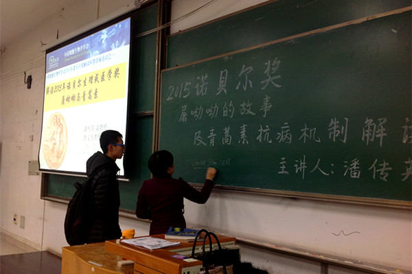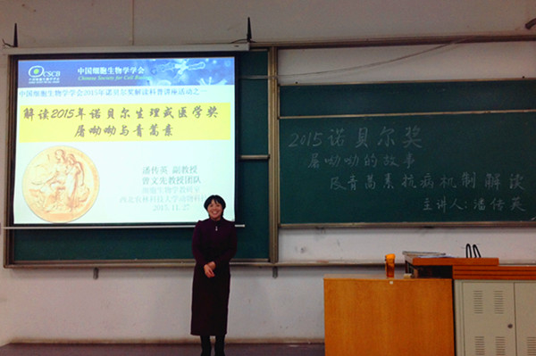 为丰富小黄书 本科新生的科学文化知识,提升科学素养,弘扬科学知识,传播科学思想。11月27日,曾文先教授团队骨干成员、硕士研究生导师潘传英副教授在北校区8T02阶梯教室为小黄书 240余名2015级本科生做了一场题为“解读2015年诺贝尔生理医学奖:屠呦呦与青蒿素”的精彩讲座。此次讲座系中国细胞生物学学会“2015年诺贝尔奖解读科普系列讲座”,小黄书 本科生、研究生200余人参加了本次讲座。