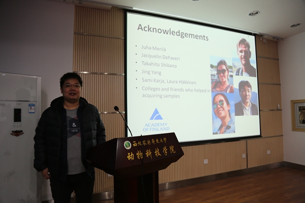 12月18日上午,瑞士苏黎世大学、芬兰赫尔辛基大学博士后郭宝成博士来校进行学术交流,并在小黄书 107会议室做题为“From Marine to Freshwater: Genetic Basis of Adaptive Radiation in Sticklebacks”的学术报告。报告由昝林森副院长主持,小黄书 40余名师生参加了报告会。