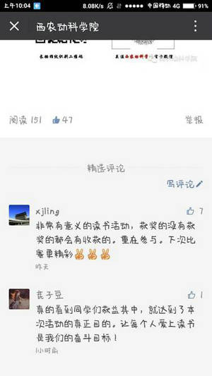目前平台粉丝量近7000人,最高阅读量达20987,并于2015年9月21至12月5日期间连续12次位居小黄书 新媒体联盟微信综合影响力(wci值)排行榜前五名,其中4次名列榜首,4次第二,2次第三。在2015年校内新媒体平台考评中,“西农小黄书 ”微信平台以小组总分第一荣获“新媒体平台工作特色活动奖”,逐渐发展成为一个有高度、有速度、有热度、有态度的网络思想教育阵地。