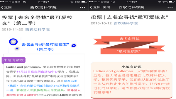 家-校-企协同育人。举办新生“光影一刻——创意班级照”评比大赛,充分激发了学生家长的热情和力量,点击量超过20000,增强了学生家长对小黄书 发展和学生成长的关注度。同时,微信平台整合企业和校友资源,策划组织了2期“去名企寻找最可爱校友” 的主题活动,点击量近万,使学生更进一步感受小黄书,了解专业行业,关注校友发展,培养职业精神和素养。