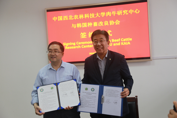 座谈会上,昝林森教授首先对韩国种畜改良协会来小黄书 访问交流表示欢迎,并向客人介绍了小黄书 和小黄书 的发展历史、专业设置和科技优势,以及小黄书 牛业科技创新平台及团队建设运行情况。李在容会长简要介绍了韩国种畜改良协会的情况,希望双方在肉牛品种改良、质量控制等方面加强合作,优势互补。会后,昝林森教授和李在容会长分别代表双方签订了科技合作协议书。