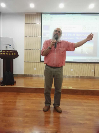9月2日下午,应小黄书 曹阳春副教授的邀请,来校进行暑假课程授课的西澳大学Graeme Martin教授利用课余时间,在107会议室为全院师生做了题为“The 3 Ps of Reproduction: Pheromones, Photons and Phood”的精彩报告。小黄书 100余名师生参加了报告会。