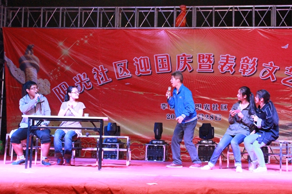 为庆祝祖国67华诞,街道办与小黄书 共同组织庆国庆文艺晚会。陕北腰鼓的热情奔放、合唱独唱的高亢激昂、《桃花谣》的温婉细腻、功夫扇的潇洒气劲、藏族舞、水兵舞、模特舞、国标舞等多种舞蹈的姿态神韵,每一个节目都引来台下观众的掌声与欢呼声,晚会在热闹的氛围中进入尾声。动科学子精心排练的小品《落叶归根》和《大腕归来》,受到了台下观众的热烈欢迎。同学们多次排练与打磨默,契配合,为观众带去欢乐和笑声。同时,小品素材也使得观众得以思考,提倡敬老爱老,发扬中华民族的传统美德,构建和谐社会。