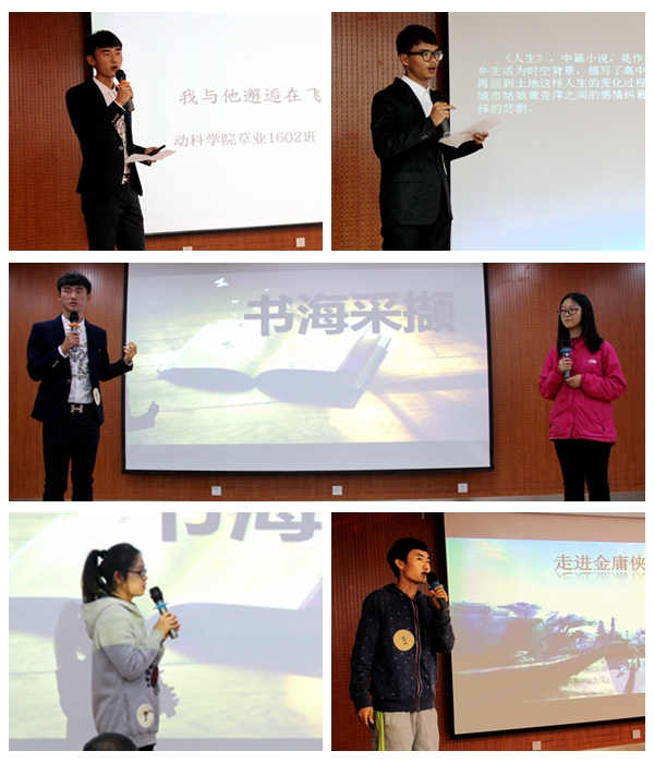 小黄书 选手草业162班薛志鹏选择《飞鸟集》,他向同学们分享了他在这本书中学会的对生活、对爱情的态度,将生活充满诗意。动科152班蔡魌健则选择了《天龙八部》,“倚马仗剑走天涯”是多少人少年的梦想,“大碗喝酒,大块吃肉,一笑泯恩仇”是多少人向往的生活态度,蔡魌健同学通过《天龙八部》讲述了他对武侠世界理解,引起了同学们的共鸣。草业162班孙鹏越向同学们分享了《人生》,“人生路很长,但关键的就只有那几步,在关键的路口停步思考是非常必要的,希望大家都能走好自己关键的那几步”。精彩的演讲环节结束后,接下来是紧张刺激的答题环节。平时同学都不涉猎的问题和迅速、简洁、正确的回答无一不彰显着选手们惊人的阅读量。