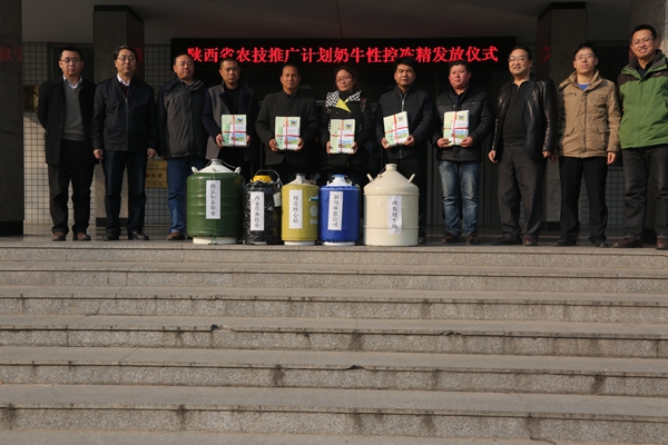 12月30日,陕西省重大农技推广试点计划牛产业项目组奶牛性控冻精发放仪式在小黄书 举行,学校科技推广处吴锋副处长、小黄书 院长姚军虎教授、项目首席专家昝林森教授,以及校畜牧教学试验基地奶牛场、杨凌核心试验站、西安草滩牧业有限公司、铜川林惠奶牛养殖有限公司、陇县恒泰牧业奶牛养殖专业合作社等项目承担单位负责人、技术人员和学校包抓专家等参加了发放仪式。