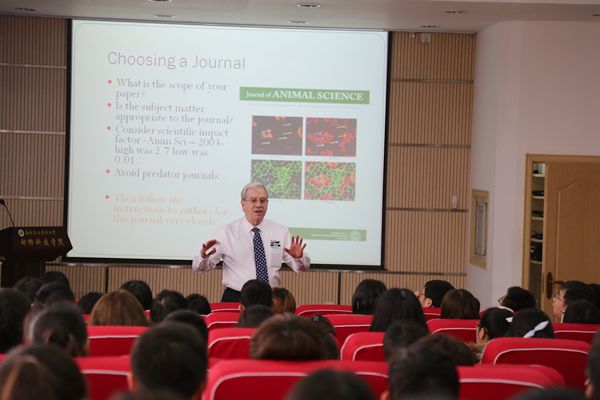 24日下午,在107会议室,James Sartin博士作了题为“Surviving the review process: an editor's perspective”的报告。小黄书 部分教师及研究生120多人聆听了报告。James Sartin博士首先介绍了如何正确选取论文应该投的杂志。接着他从主编的角度讲述了论文写作各个部分的要点及可能导致拒稿的常见错误,同时强调了投稿时的注意事项及如何正确与审稿人进行交流。最后介绍了《Journal of Animal Science》杂志的基本情况。