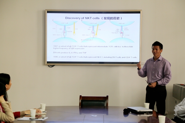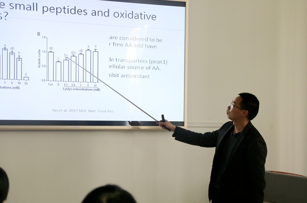 任文凯博士的报告题目为“GABA mediates IL-17 expression during intestinal bacterial infection”。报告主要从ETEC的研究现、ETEC感染促进IL-17的表达、表达通路的探索、ETEC与肠道微生物的关系以及代谢组学分析几个方面进行报告;杨冠博士开展了题为“Natural Killer T cells: a small population with big possibilities for pigs”的精彩报告,主要介绍了NKT细胞发现的历史、NKT细胞的特点以及猪的NKT细胞是否可以作为靶向治疗目标等相关研究的结果;最后,尹杰博士以题为“猪氧化应激与营养代谢调控”的报告收尾,向大家介绍了猪的氧化应激大致作用过程、生产上诱导的因素以及营养素对氧化应激的调控作用。会上,小黄书 师生与三位博士进行深入的探讨与交流。