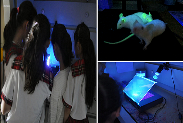 在生殖生物学与细胞工程研究团队实验室中,团队4名博士研究生分别向同学们介绍了精密仪器设备的名称及用途,各类显微镜的基本使用方法,并指导同学们进行了简单的操作及如何进行细胞观察。当看到转基因小鼠在紫外线的照射下会发出绿色荧光时,同学们的好奇心被瞬间激发,争先恐后地问着各种问题。团队中的博士生们以最简单易懂的方式,耐心向同学们解释了小鼠身上荧光的形成原理。