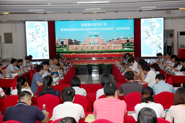 8月17日—18日,由小黄书 动物营养与健康养殖科研创新团队负责人姚军虎教授牵头承担的国家重点研发计划项目“畜禽肠道健康与消化道微生物互作机制研究”实施方案论证会暨启动会在小黄书 召开。科技部中国农村技术开发中心农业高技术处葛毅强处长,陕西省科技厅林黎明副厅长,项目咨询专家组专家中国科小黄书 院士、江西农业大学党委书记黄路生院士、浙江大学刘建新教授、南京农业大学朱伟云教授、中科院亚热带农业生态研究所副所长谭支良研究员、中国农科院北京畜牧兽医研究所副所长张军民研究员、张宏福研究员,小黄书 党委常务副书记赵忠教授、科研院孙楠处长、小黄书 赵延安书记、项目主持人姚军虎教授以及各课题负责人、项目参加单位代表、项目骨干等相关人员100余人参加了会议。