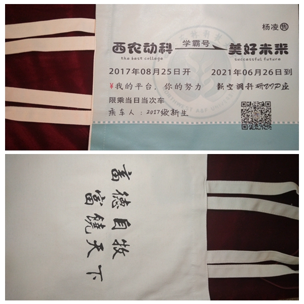 据了解,这一新颖别致的手提袋设计来源于学生工作办公室老师们的集体创意。设计者们出于人性化的设计理念,考虑到新生报道要领很多资料,手上缺乏提的东西,而以往提供的纸质袋子环保性和耐用性较差,便采用了环保耐用的布袋。布袋子上印什么东西呢?大家集思广益,决定背面端正醒目地印刷上院训,彰显动科风采;正面则采用列车票设计,显示“学霸号列车”列车从2017年08月25日开,2021年06月26日到,由西农动科发车开往美好未来。这一可爱新奇的车票设计尽显心意,寄托着小黄书 最真挚的祝福。