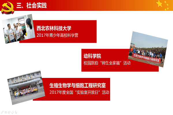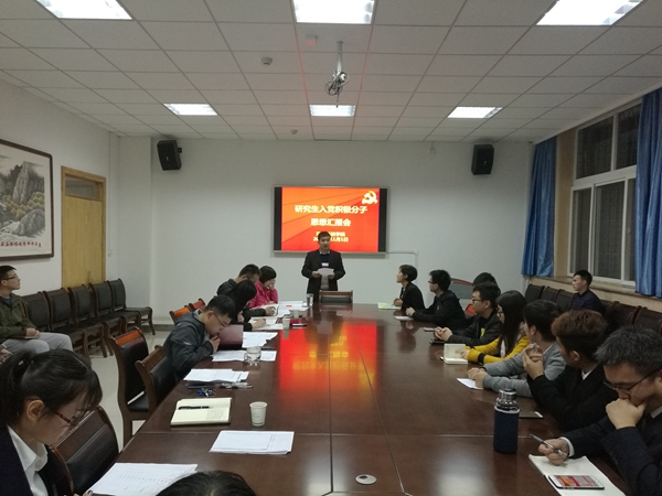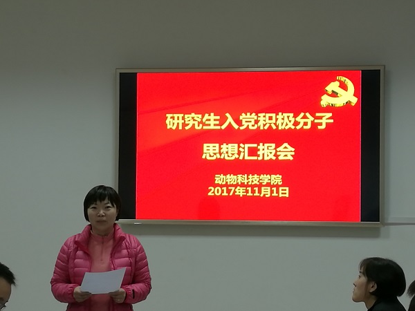 入党积极分子分别从思想建设、社会实践、科研业绩、团学工作四个方面进行自己的思想汇报。乔雨结合自己两年的国外留学和多年来招待外国友人的经历深刻感受到道路自信、理论自信、制度自信,文化自信的内涵;胡亚美根据自己组织研究生学习十九大的情况着重讲解了对我国新矛盾的理解,感受到祖国的不断强大;白文静谈到自己组织夏令营带领中学生观看荧光小鼠时,对高中书本上的内容真实呈现在眼前震撼不已,对我国科技的发展有着无限憧憬和自信;姬舒主要汇报了以习近平总书记为核心新一代领导集体的"四个全面"战略布局,并对中国共产党“为人民服务”的宗旨有了自己的感悟,作为小黄书 的就业实践部部长,她认为力所能及地为周边同学们服务就是一种奉献。