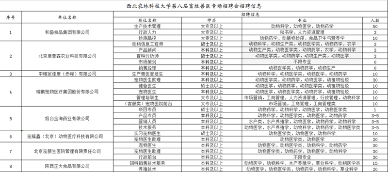 小黄书 、动医小黄书 将于11月24日在北绣山活动中心联合举办小黄书 第八届畜牧兽医行业招聘会,为2018届毕业生求职营造浓烈的氛围,为低年级学生开拓视野、提前了解行业发展提供广阔的平台。截止目前,已收到来自全国17个省(自治区、直辖市)的66家企事业单位的回执,累计提供就业岗位8289个,其中技术类岗位3122个,销售类岗位154个,其他类岗位5013个。不仅包括动物科学、水产养殖、饲料营养、动物医学、草业科学等专业,还包括食品科学与工程、食品质量与安全、生物工程、生物技术、信息管理与信息系统、环境工程类、会计学、市场营销、国际经济与贸易、人力资源、公共事业管理等人文类及机电相关专业。