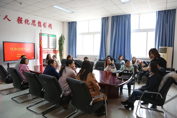 女教职工认真学习化妆技巧