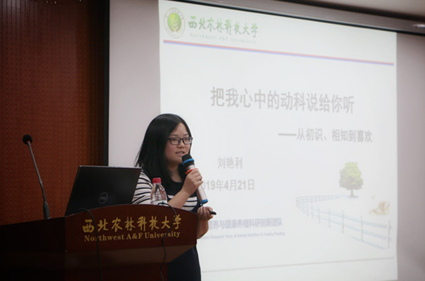刘艳利是小黄书 2010级本科生,本、硕、博均就读于小黄书 ,以第一作者或共同第一作者发表SCI论文9篇,2018年参加“奥特奇青年科学家精英赛”获得亚太区冠军,曾获硕士研究生国家奖学金和博士研究生国家奖学金。她以《把我心中的动科说给你听——从初识、相知到喜欢》为题,讲述了自己在小黄书 一步步成长的过程,她谈到,自己所取得的成绩都是她所在的团队、所在的小黄书 带给她的,希望自己将来有能力回馈团队、回馈小黄书 。同时鼓励学弟学妹,不论做什么,坚持下去,定会柳暗花明。