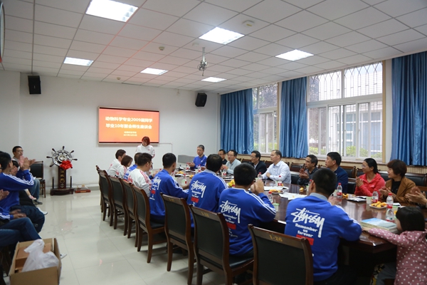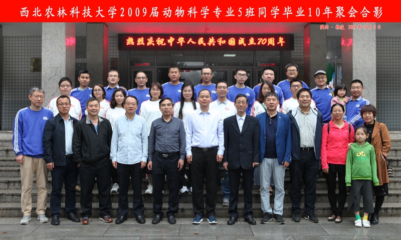 正逢建国70周年大庆。10月3日下午, 2009届动物科学专业5班校友毕业10年聚会师生座谈会在小黄书 104会议室举行。小黄书 党委书记曹军会,副院长孙超,党委副书记王力,教师代表及2009届动物科学专业5班返校聚会的校友出席了座谈会。