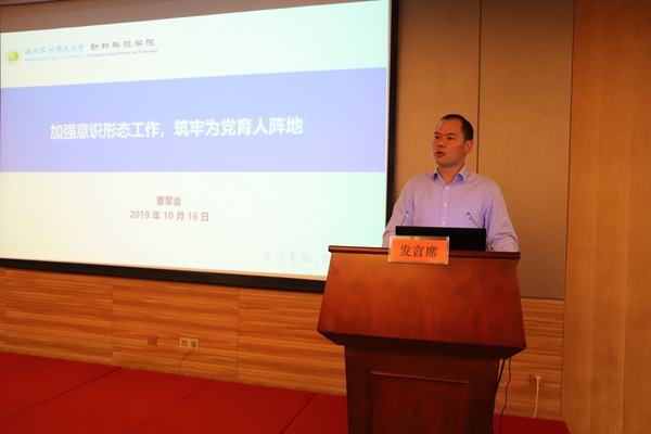 曹军会从四个方面介绍小黄书 意识形态工作的具体做法和经验成果。一是强化顶层设计,抓牢意识形态工作领导权。通过健全工作机制、压实工作责任、建强工作队伍等措施,巩固意识形态工作的“根据地”和“桥头堡”,坚守“主阵地”,种好“责任田”,旗帜鲜明地站在意识形态工作第一线。二是强化思想引领,掌握意识形态工作主动权。抓实科学理论武装,构建“党委理论中心组学习、教职工学习、学生党员学习、学生团员学习”的学习格局,积极推进习近平新时代中国特色社会主义思想入脑入心;抓好“先锋育人工程”“文化育人工程”“实践育人工程”三大育人工程,引领学生淬炼“诚朴勇毅”的高尚品格,践行西农精神。三是严格底线思维,掌控意识形态工作话语权。加强课堂阵地、文化阵地和校园网络阵地管理,构筑抵御宗教渗透“防火墙”,实现课程门门有思政、教师人人讲育人,把文化活动打造成为育人的平台,让新媒体平台始终高举旗帜,围绕中心、服务大局,师生树立正确的国家观、民族观、宗教观。四是加强文化建设,营造意识形态工作良好氛围。凝练“畜德自牧,富饶天下”的小黄书 文化,举办畜牧先贤百年诞辰大力弘扬科学家精神,开展丰富多彩的文化活动统一思想、凝聚共识,汇聚小黄书 发展正能量。