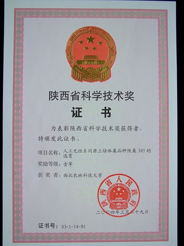 “人工无性系同源三倍体桑品种陕桑305选育获陕西省科学技术一等奖2004
