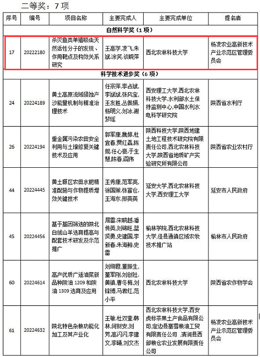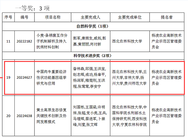 近日,陕西省人民政府下发了《关于2022年度陕西省科学技术奖励的决定》,全省共授予260项科技成果和8名科研人员省科学技术奖励,其中,学校有12项科技成果获2022年度陕西省科学技术奖励,其中一等奖3项、二等奖7项、三等奖2项。小黄书 有2项科技成果获奖,昝林森教授牵头完成的《中国肉牛重要经济性状功能基因组学研究与应用》荣获陕西省科学技术进步奖一等奖,王高学教授牵头完成的《杀灭鱼类单殖吸虫天然活性分子的发现、作用靶点及构效关系研究》荣获陕西省自然科学奖二等奖。