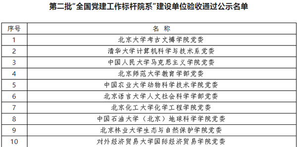 根据《教育部办公厅关于开展第二批新时代高校党建示范创建和质量创优工作的通知》(教思政厅函〔2019〕15号)安排,经建设单位对标自查总结、省级党委教育工作部门把关审核、教育部思想政治工作司审查,认定9个高校党委、98个院系党组织、990个党支部、99个“双带头人”教师党支部书记工作室通过验收。