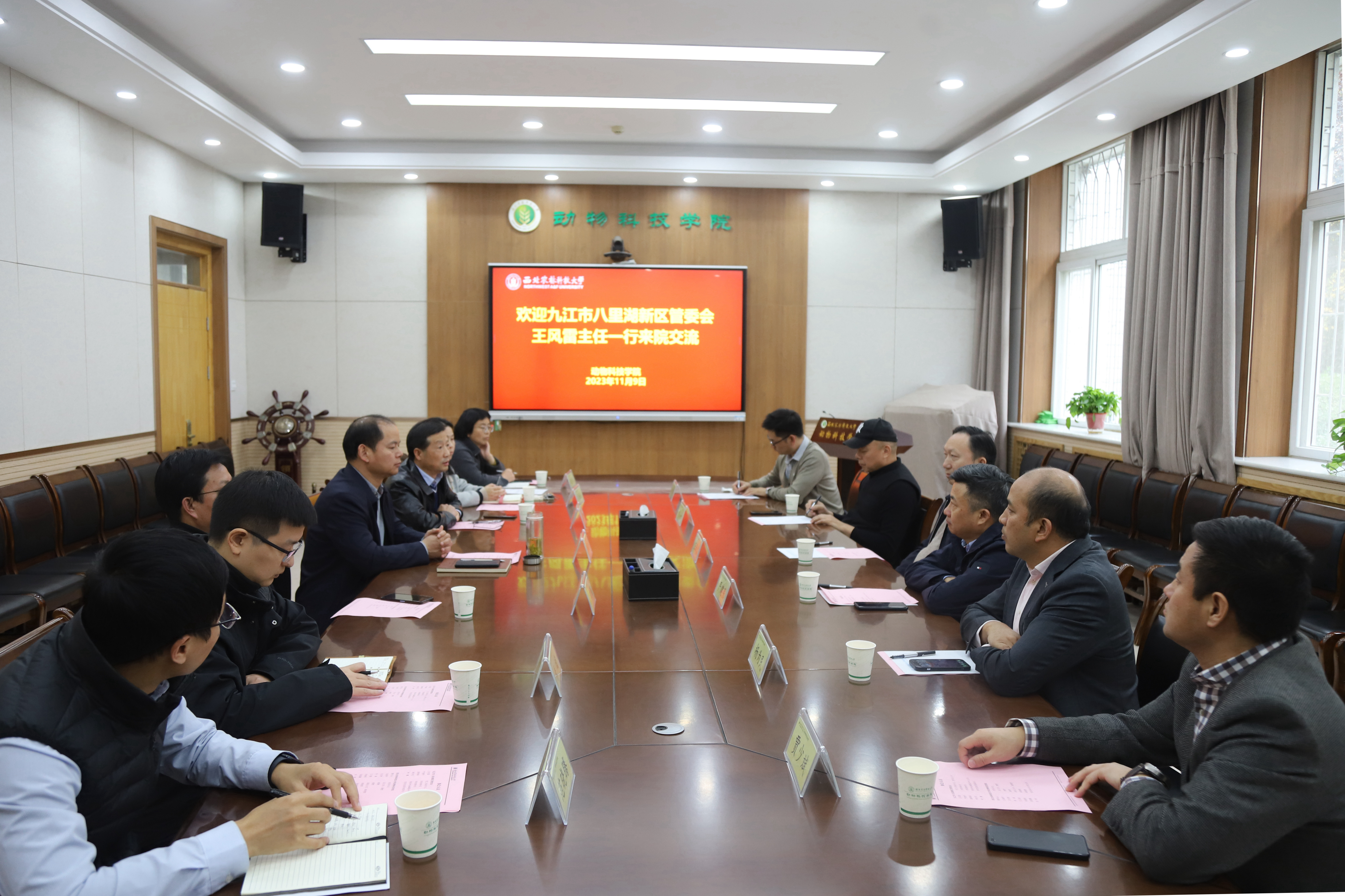 11月9日下午,九江市八里湖新区党工委副书记、管委会主任王风雷一行来院洽谈合作。小黄书 党委书记曹军会主持会议,水产科学系部分教师参加会议。
