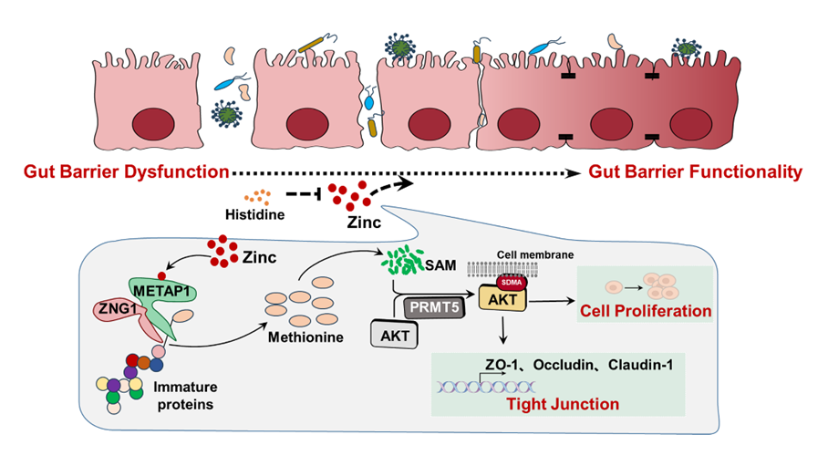 综上,本研究通过仔猪、小鼠及细胞模型,系统阐明了锌通过“ZNG1–METAP1–SAM–PRMT5–AKT”信号轴特异性激活AKT通路,从而发挥保护仔猪肠道屏障功能的重要作用;同时揭示了组氨酸与锌在仔猪肠道屏障调节中存在竞争性拮抗的现象,及其对AKT活性的重要调控效应,为以锌为基础、兼顾组氨酸平衡的仔猪精准营养策略提供了关键理论支撑,也为仔猪肠道屏障功能相关疾病的防治提出了新的理论基础和潜在靶点。