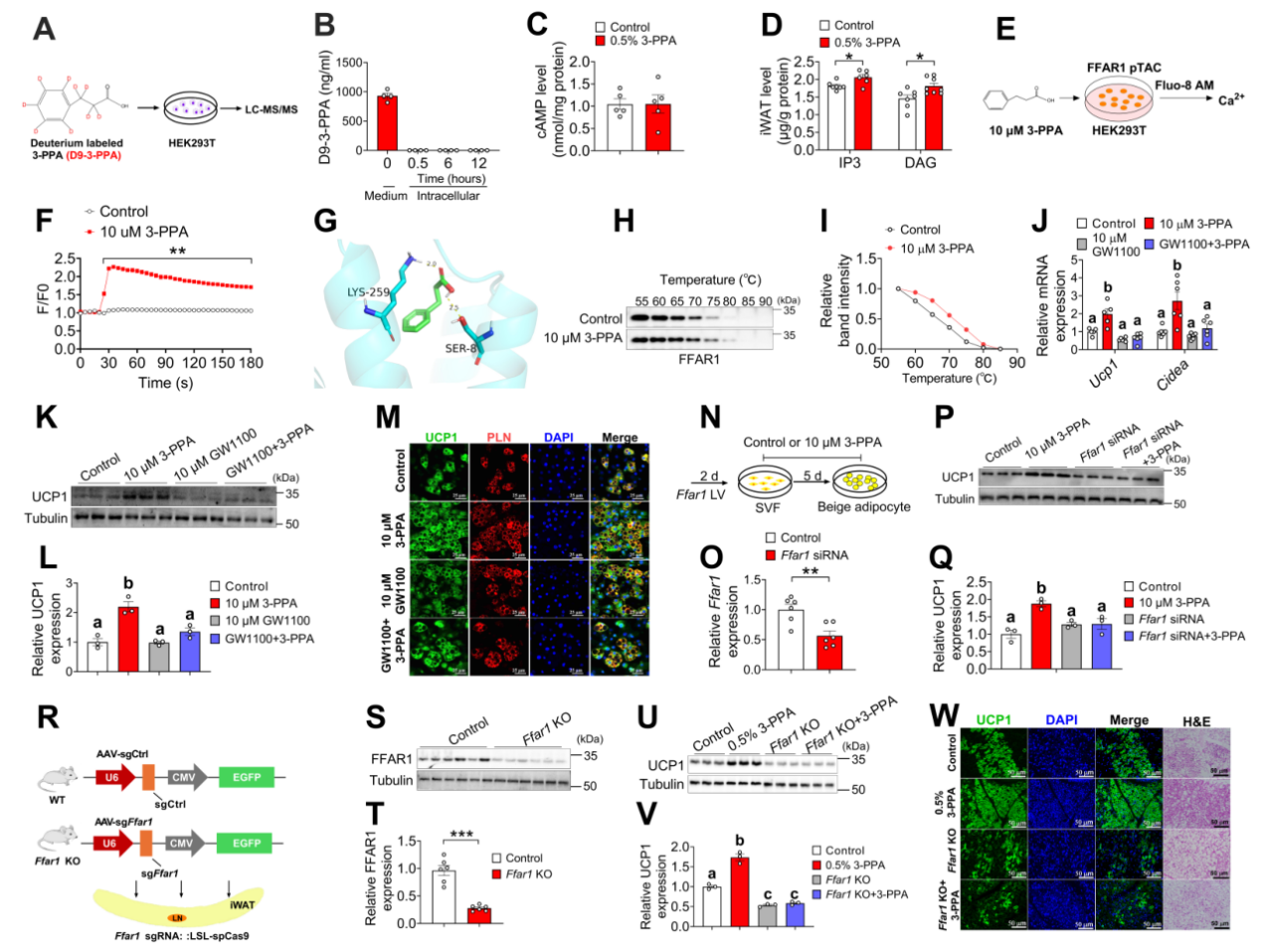 机制上,3-PPA通过作用于米色脂肪组织内M2样巨噬细胞膜上的游离脂肪酸受体1(FFAR1),刺激其分泌C-X-C基序趋化因子13(CXCL13)。CXCL13进而招募T滤泡辅助细胞(Tfh),并通过Tfh细胞表面的C-X-C 趋化因子受体5(CXCR5)信号,促进白细胞介素-4(IL-4)的分泌,最终调控米色脂肪细胞的生成。通过谱系追踪分析,进一步证实3-PPA诱导产生的米色脂肪细胞主要来源于平滑肌肌动蛋白阳性(SMA+)的脂肪祖细胞。