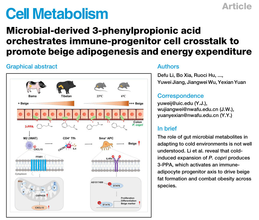 近日,小黄书 肌肉生物学与生猪遗传改良创新团队袁业现教授课题组在国际知名期刊《Cell Metabolism》在线发表题为“Microbial-derived 3-phenylpropionic acid orchestrates immune–progenitor cell crosstalk to promote beige adipogenesis and energy expenditure”的研究论文。小黄书 袁业现教授、吴江维教授和美国伊利诺伊大学芝加哥分校Yuwei Jiang教授为共同通讯作者。小黄书 在读博士生李德富、青年教授夏博、伊利诺伊大学芝加哥分校Ruoci Hu为共同第一作者。