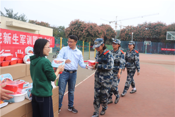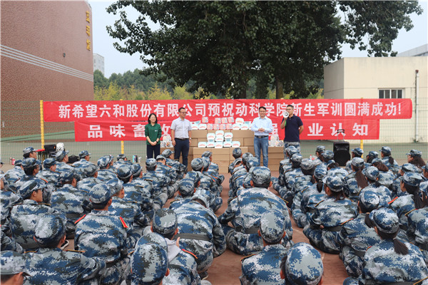 9月24日下午,军训即将接近尾声,炎热的军训场迎来了美食盛宴,新希望六和股份有限公司母猪场运营中心总经理、校友王益兵博士、新希望六和股份有限公司校招(陕西、宁夏)负责人杨俊亚经理及小黄书 党委副书记王力携两百多份新希望六和集团生产的自热小火锅和方便米饭亲切慰问参训新生。