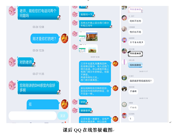 面对突如其来的疫情,牛生产学教学团队第一时间响应学校“停学不停课”的号召,立即组建教学研讨QQ群,讨论本学期网络教学阶段的教学目标、内容和考核方式,明确了加强全过程考核的教学任务。在已有慕课基础上,确定了“MOOC+直播+答疑”的混合式教学方式,在动物科学专业2017级中开展教学实践,教学效果良好。