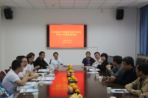时值双节,秋高气爽。10月2日,小黄书 2003级水产养殖学专业本科生在毕业十周年之际返回母校,与小黄书 领导老师们畅聊回忆,分享当下,展望未来。学校校友会副秘书长张红亮、院长姚军虎、党委书记赵延安、副院长昝林森、副院长孙超、党委副书记王晓娟、副院长王力及水产科学系部分教师参加本次座谈会。